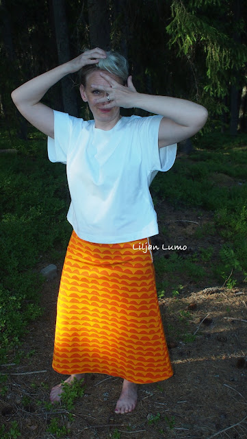 Olen ihastunut hameisiin, yksinkertaisiin sellaisiin! Arkivaatteiden sarjan alle tekemiäni vaatekertoja syntyi toukokuun aikana kolme, kaksi paitaa ja kolme eri mittaista hametta. Tässä esittelyssä vol.1: Marimekon kankaasta (Beata?) ompelemani hame sekä Marimekon valkoisesta trikoosta ompelemani väljä valkoinen pusero. Molemmat tämän hetkisiä lempivaatteitani ja siksipä ne ovat olleet käytössä jo kuukauden verran työarjessa.